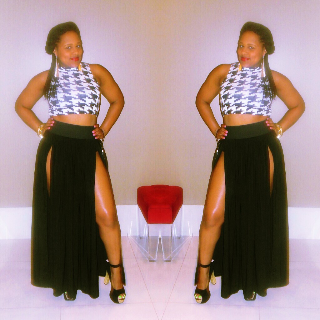 Saturday night I stepped out of my comfort-zone and went for a bold, seductive look. I rocked a black double split maxi skirt (which I absolutely love!) from DeCordon Online Boutique. I paired it with a houndstooth crop top from Boohoo Online Store and chunky heel platform sandals from ShoeDazzle. I kept it simple with the accessories for this outfit as well and rocked thick gold needle earrings and gold stackable bangles from Forever21 and Aldo.