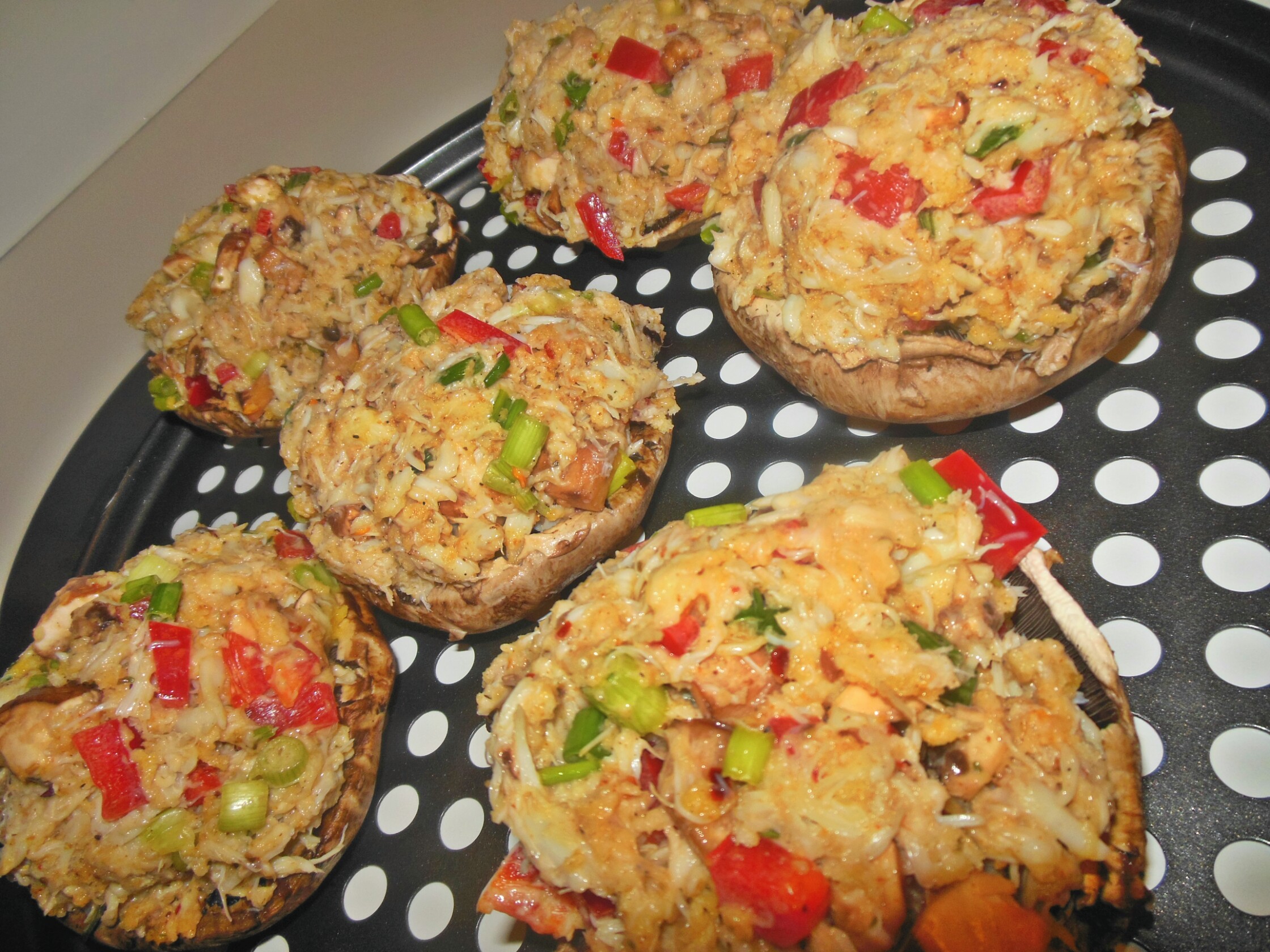 Preheat oven to 375 degrees. Lightly rinse portobello mushrooms and pat dry. Cut the stems off of the mushrooms and use a spoon to hollow out the middle of the mushrooms. Toss the mushrooms in olive oil and place to the side. Combine crab, diced mushrooms, red pepper, green onions, egg, mayo, seasonings and bread crumbs in a large bowl. Gently fold ingredients together. Try not to stir and whip the mixture too much because you don’t want to break up the lump crab pieces. Have a quick taste test to ensure the mixture suits your taste buds. Using about 2 tablespoons of filling, stuff portobello mushrooms. Place stuffed mushrooms on a baking sheet lined with aluminum foil. Bake stuffed mushrooms for 20-25 mins. Allow stuffed mushrooms to cool for a few minutes and enjoy with a side salad!
